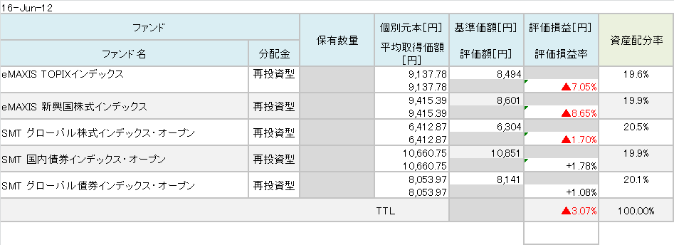 6月16日のアセットアロケーション比率と積立評価額の増減状況となります。