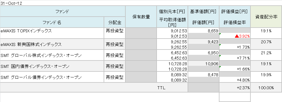 eMAXIS TOPIXインデックスは▲3.92%ですが、その他資産はプラスで5資産合計で+2.37%となっています。SMTグローバル株式インデックスオープンが+7.71%と前回よりもやや減少していますが好調です。