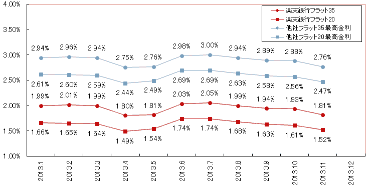 楽天銀行のフラット35の12月度金利が確定しました。返済期間が21年以上の金利が年1.80%、20年以下が1.51%と依然低水準となっています。4か月間連続で低下しています。