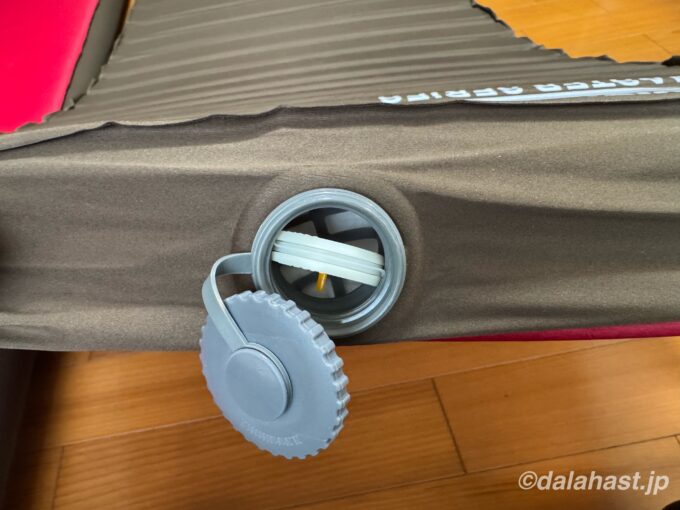 このマットは「自動膨張式」で、バルブを開けるだけで自動で空気がはいってある程度膨らみます。