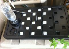 液肥槽も100円均で売っている、プラスチック製の四角いトレー型のざるとゴミ箱をつかったり、培地もスポンジとハイドロボール、そしてお茶袋で格安でつくることができます。
