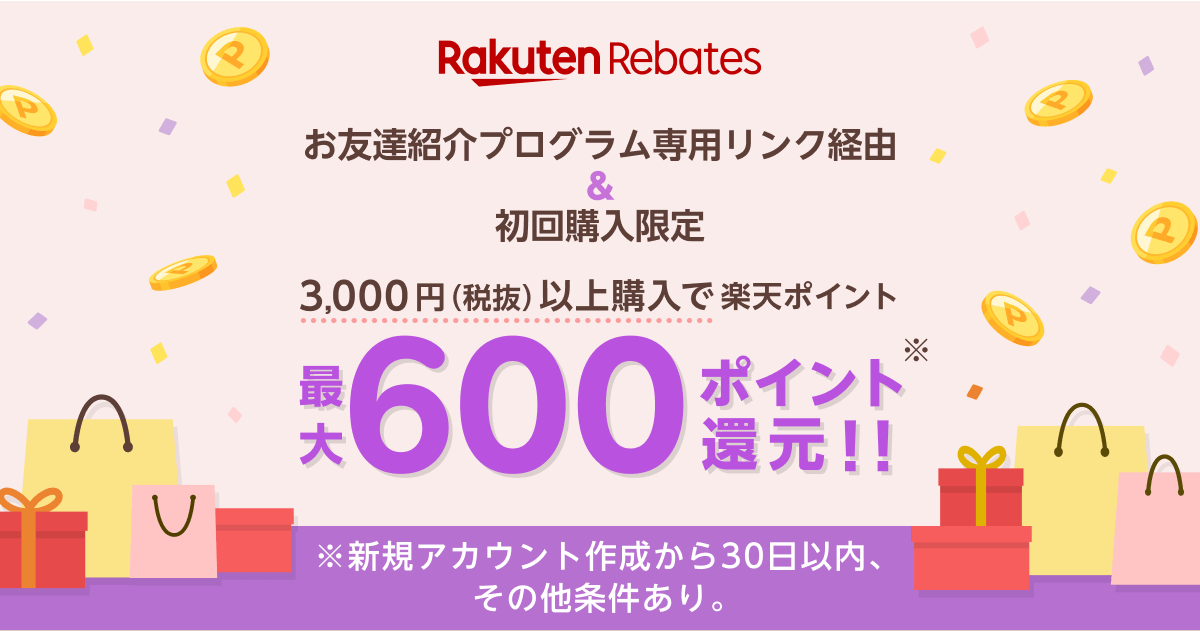 Rebates会員登録してから30日以内に、Rebates経由で合計金額3,000円以上(税抜・送料別・ポイント、クーポン利用別)お買い物をされた方へ最大500ポイントがプレゼント!