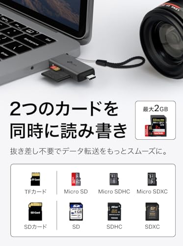 SDカードとmicroSDカードの両方に対応しているため、カメラやドローン、スマートフォンなど異なるデバイスのデータをまとめて扱えます。